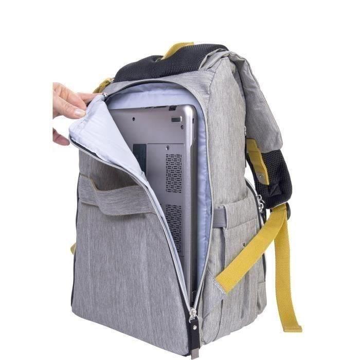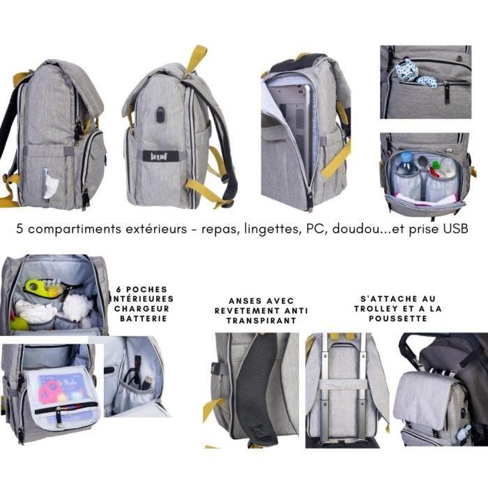 tres fonctionnel et bien organisé,espace REPAS, espace PC, poche lingettes, 6 poches intérieures,port USB, attaches poussette, strap trolley et bretelles ergonomiques anti transpiration, toile déperlante et légere, tapis a langer