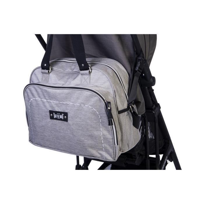 organisé autour de 2 vastes compartiments, large ouverture zippée, 8 poches, tapis a langer,snack bag thermo isolant 0,50CL avec poignée pressionnée, clips poussette, bandouliere réglable , pieds de protection, matiere chinée imperméable, détails effet cuir