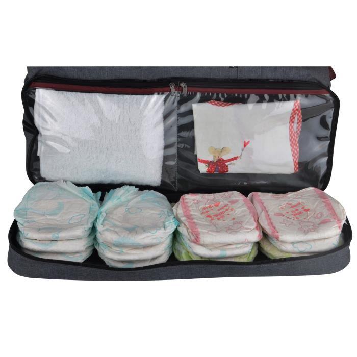 Sac a langer grand format avec 3 grands compartiments a large ouverture - poches et organisateur 6 accessoires - sac repas thermo isolant et sac toilette avec mousquetons - tapis a langer et sac linge sale - trousse pharmacie et accessoires - trousse doudous - grand compatiment zippé a la base du sac pour stocker jusqu
