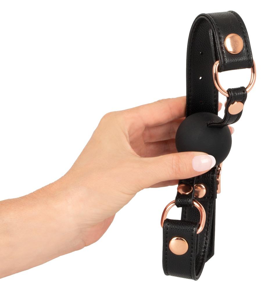 Un bâillon en silicone dur et rond (Ø 4 cm) sur serre-tête en aspect cuir de haute qualité avec décoration en métal couleur or rose.
