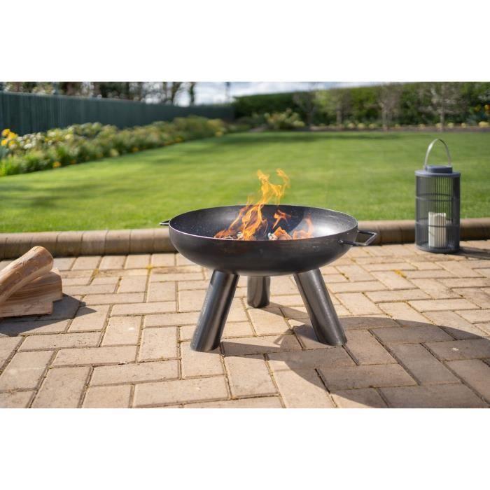Acier résistant, finition a l'huile brossée. Les trois pieds offrent une stabilité et augmentent le flux d'air pour la dissipation de la chaleur. Utiliser du bois non traité, de petites bûches seches ou des briquettes de bois Assemblage rapide, poignées faciles a soulever. Instructions incluses. Dim : H30 x L50 x P50