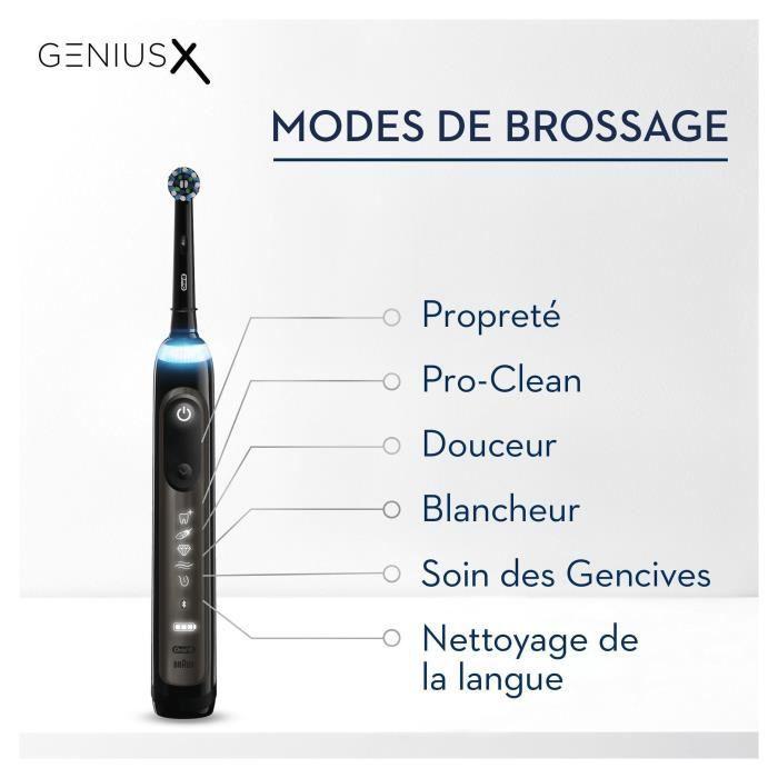 La brosse a dents Oral-B Genius X est équipée de capteurs de mouvements et de l'intelligence artificielle permettant de reconnaître votre style de brossage et de vous guider pour obtenir les meilleurs résultats possibles au quotidien - Il est désormais plus facile que jamais de se brosser les dents comme votre dentiste le recommande, afin d'obtenir un nettoyage supérieur et des gencives plus saines - Cette brosse a dents parfaitement avancée protege vos gencives délicates et aide a prévenir l'apparition de problemes futurs : l'association de la nouvelle technologie révolutionnaire Gum Guard, de la fonction SmartRing 360 et du contrôle de la pression réduisent la vitesse et émettent un signal si vous exercez une pression trop élevée, pour une routine de brossage en douceur - Enfin, cette brosse a dents est livrée avec une batterie au lithium-ion qui dure plus de 2 semaines avec une recharge - Avec la brosse a dents Oral-B Genius X Édition spéciale, votre brossage sera forcément réussi - Il n'est pas étonnant qu'Oral-B soit la marque de brosse a dents la plus utilisée par les dentistes eux-memes dans le monde.