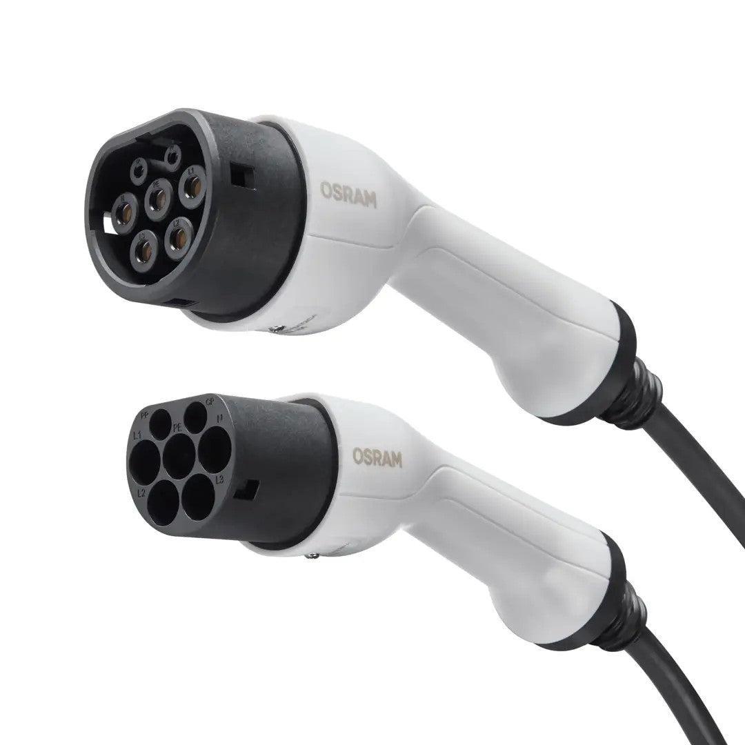 Ce câble de charge Type 2 vers Type 2 signé OSRAM est la solution idéale pour la recharge de véhicules électriques ou hybrides rechargeables, à partir de stations de charge 16A triphasées. Compatible avec toutes les bornes dotées d?un connecteur Type 2, il offre une puissance de charge jusqu?à 3,3 kW. Avec sa longueur de 5 mètres, il assure une connexion simple et pratique aussi bien à domicile qu?en déplacement. Il est conçu pour résister aux conditions extrêmes avec une plage de température de -40 °C à +85 °C, et est livré avec un sac de rangement solide et compact. Caractéristiques techniques principales : Connecteurs : Type 2 ? Type 2 Intensité nominale : 16 A Tension : 240 / 400 V (triphasé) Puissance de charge maximale : 3,3 kW Nombre de phases : 3 Longueur du câble : 5 mètres Température d?utilisation : -40 °C à +85 °C Poignées ergonomiques Capuchons anti-poussière inclus Étui de rangement fourni Usage : bornes de recharge publiques et privées Certifications attendues : TÜV / CE