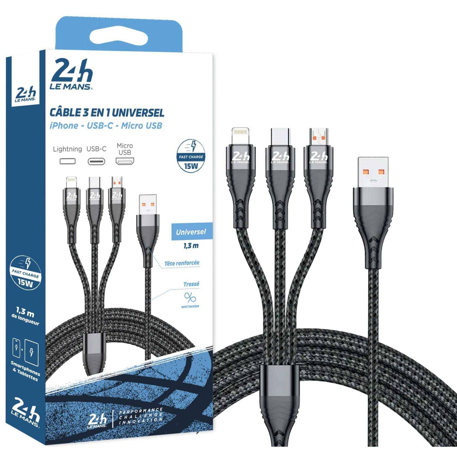 Cable USB-A triple connectiques Micro Usb Type C Lightning - 24h Le Mans