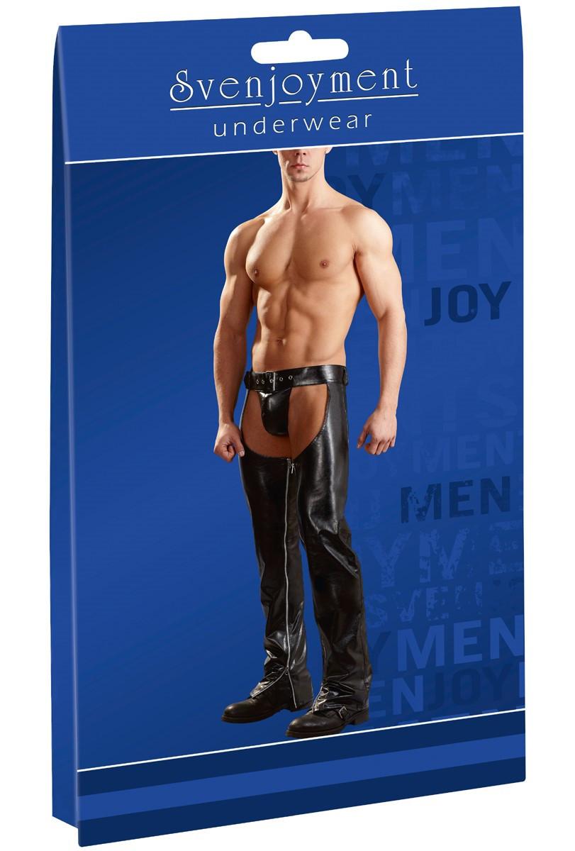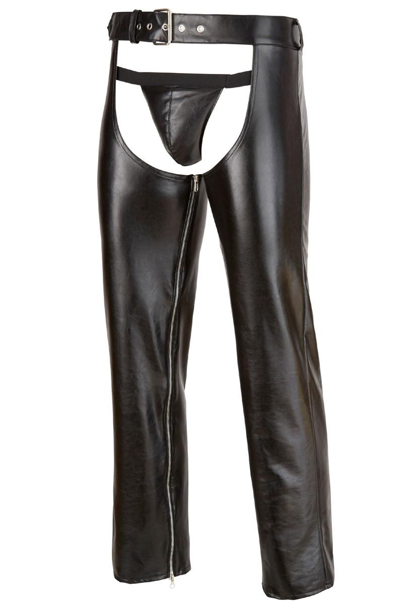 Chaps noir avec des fermetures éclair à double sens à l'intérieur des jambes.