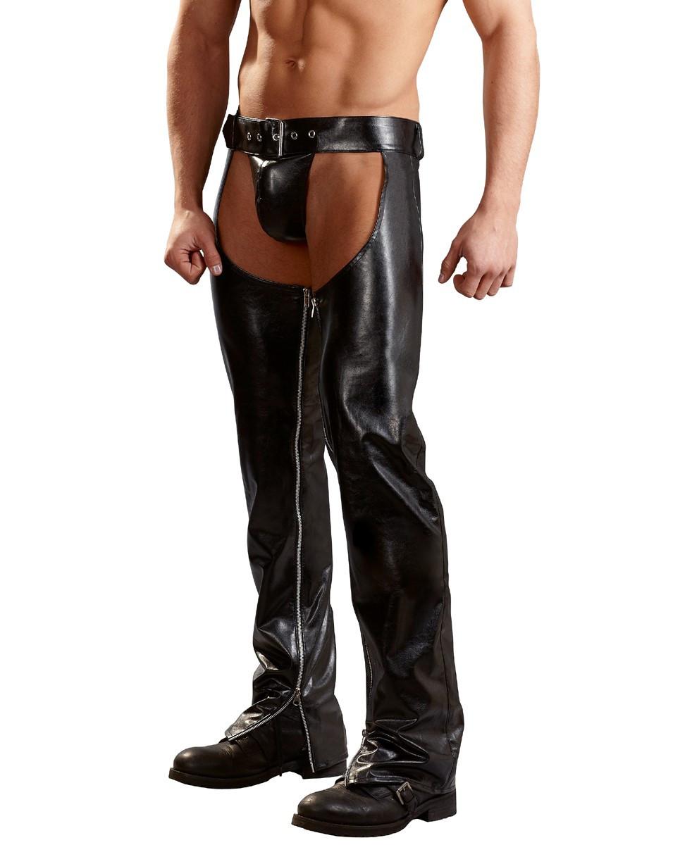 Chaps noir avec des fermetures éclair à double sens à l'intérieur des jambes.
