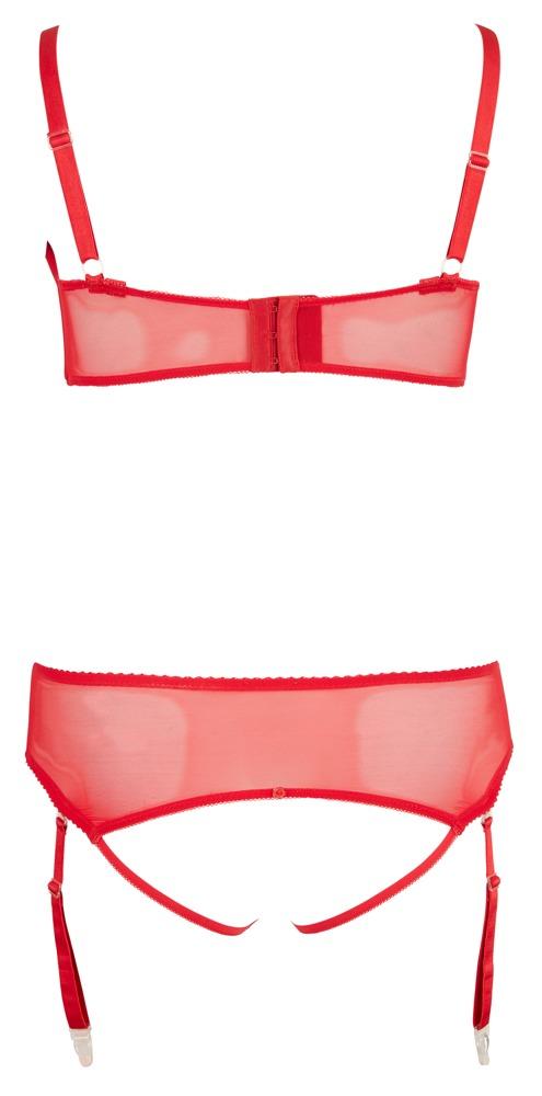 You can surprise your partner with a striptease because the bra and string have cheeky extras. The fiery red shelf bra has lace cups that can be unbuttoned and removed. The lace cups are attached to adjustable and removable straps. The bra also has slightly padded cups, wires for support and adjustable straps. This means that you can show off exactly what you?ve got. The red string with suspenders also provides a great view because the lace part at the front can be unbuttoned and removed. The four suspender straps are adjustable and removable. So treat your partner to a seductive striptease ? he won't be able to keep his hands off you for long! 90% polyamide, 10% elastane. Without stockings.