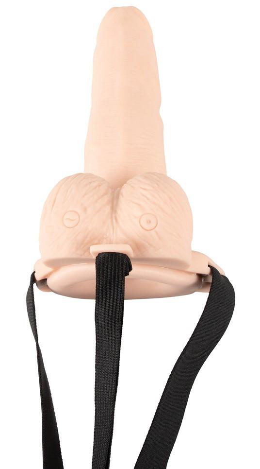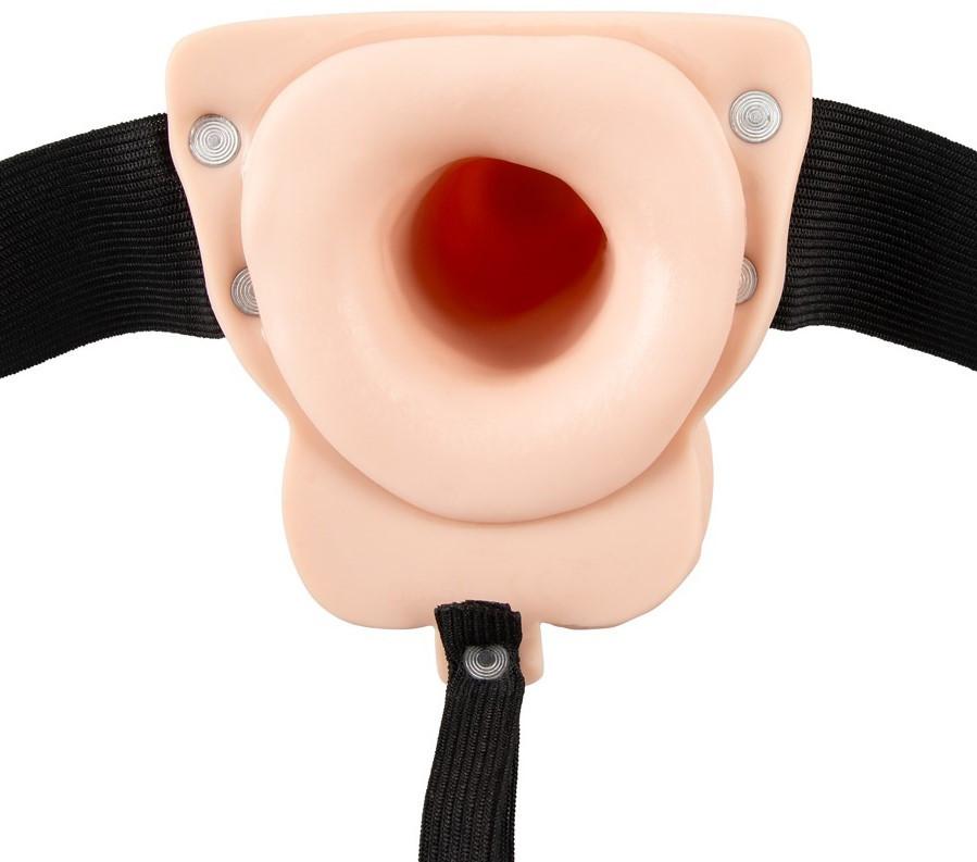 Ce vibromasseur réaliste creux est monté sur un harnais très extensible. Le jockstring-harnais peut être ajusté.