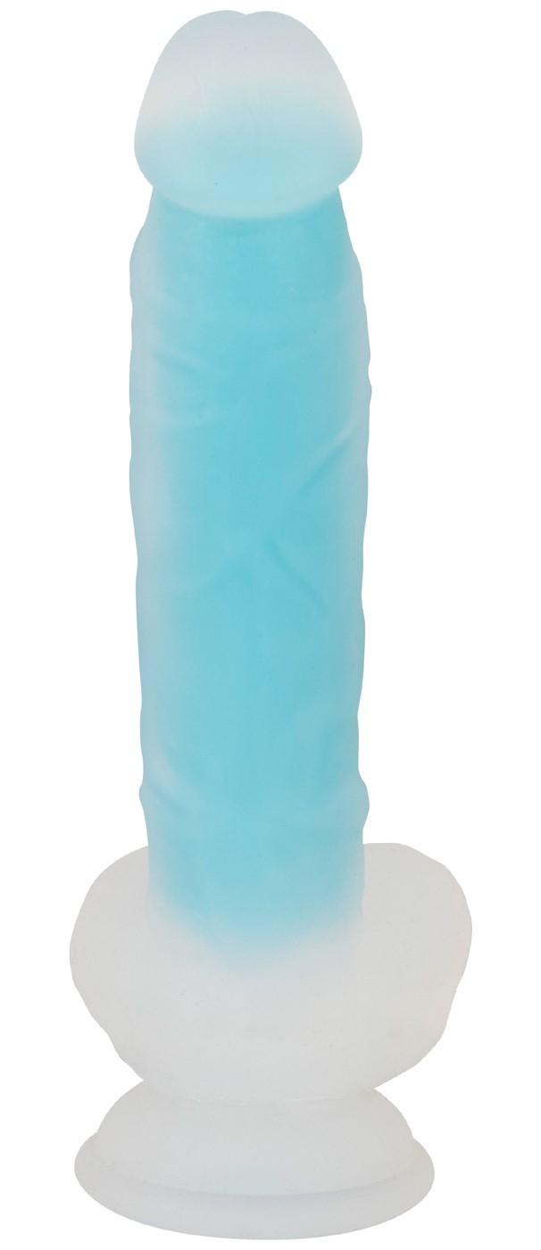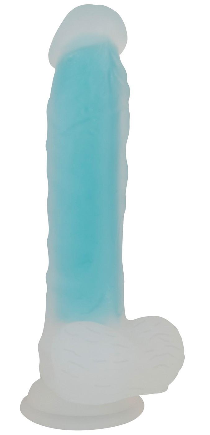 Ce gode ventouse à une surface molle translucide et un noyau turquoise dur phosphorescent qui brille dans la nuit.