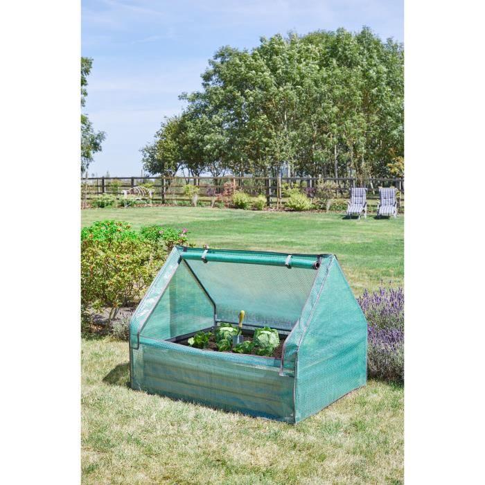fixations de qualité supérieure telles que des attaches en sangle et des fixations de couverture a crochets/boucles Le plateau surélevé protege des escargots et des chenilles Le panneau frontal zippé s'ouvre completement et se clipse facilement pour un acces total Couverture en PE haute densité Cadre et lit en acier enduit de poudre durable Assemblage facile 0.92 x 1.8 x 0.9 m