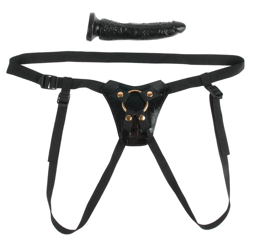 Harnais à sangles de taille réglable avec gode amovible. Gode en forme de pénis naturel avec base à succion - peut également être utilisé seul et même en mode mains libres. Le harnais à sangles en noble peau de serpent avec des détails dorés est réglable dans de nombreuses tailles : Tour de hanches jusqu'à 112 cm, cuissardes jusqu'à 102 cm de circonférence chacune.