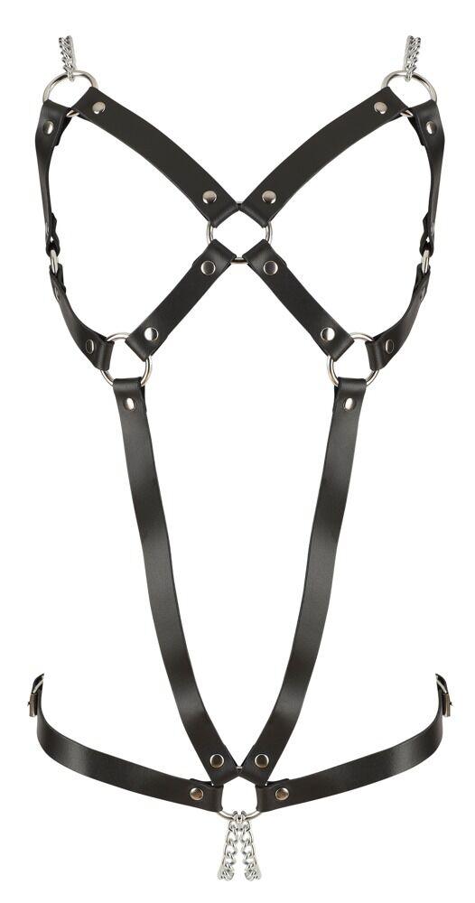 Des lanières de cuir combinées à des anneaux en acier, des bretelles de soutien-gorge en métal et deux chaînes en métal qui passent par-dessus la zone d'entrejambe autrement ouverte.