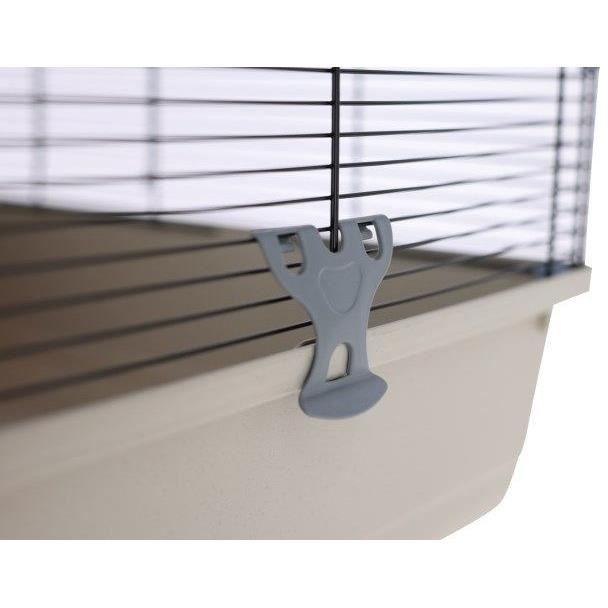 Entierement équipée avec maisonnette, gamelle (120 ml) et roue d'exercice (Ø de 14 cm), cette cage offre suffisamment d'espace grâce a la répartition sur 3 étages. Des escaliers en bois facilitent l'acces aux étages supérieurs, et des clips supplémentaires dans les coins assurent une stabilité accrue. Deux grilles (12,5 x 12,5 cm chacune) en haut et sur le côté facilitent le prélevement des animaux.