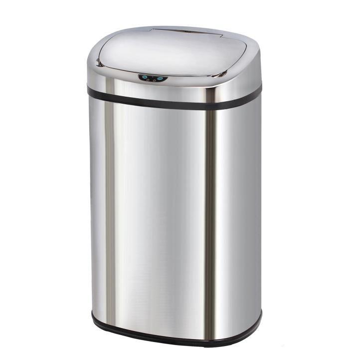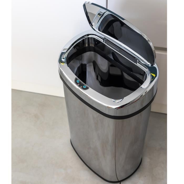 - Description du produit : Poubelle de cuisine avec un capteur sensoriel, Mécanisme : automatique, Corps : inox (0,4mm), Couvercle : ABS, Coloris : noir, Fonctionne avec 4 piles non incluses, Cerclage fourni pour éviter que la poubelle dépasse, Ouverture automatique avec système infrarouge, 2 boutons : Open & Close, Capacité