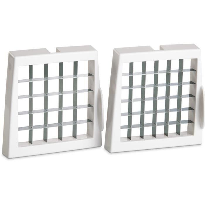 - Description du produit : Coupe-frites : Appareil à découper précis et robuste - 2 grilles amovibles avec 2 tailles différente, s : 10 et 12 mm pour couper les pommes de terre en frites ou autres légumes crus en bâtonnet - Desig, n ergonomique pour rendre la coupe plus facile : zone sur poignée anti-dérapante - Socle avec re