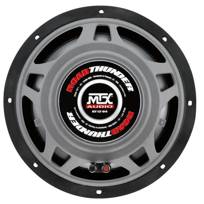 Subwoofer 30 cm (250 W RMS) ne manque pas d'atouts. Suspension caoutchouc a large débattement. Membrane en polypropylene avec logo MTX en relief. Grosse structure magnétique. Grosse bobine de 50 mm. Technologie SPV pour le refroidissement. Technologie ALDS... Un exploit affirmé.