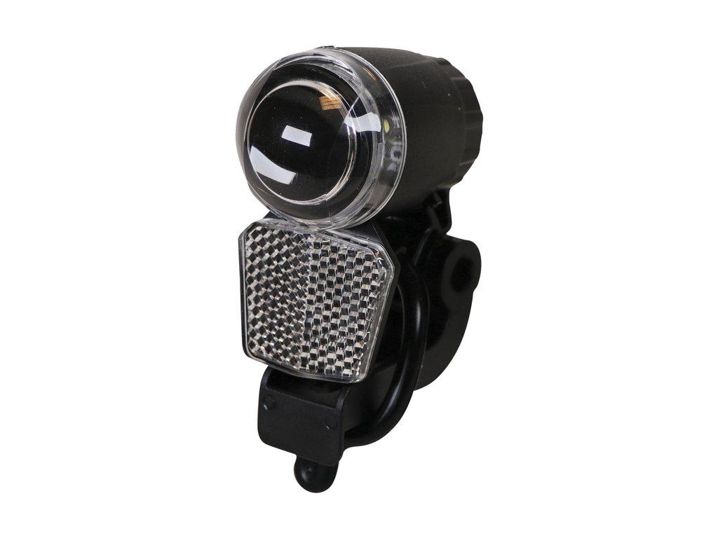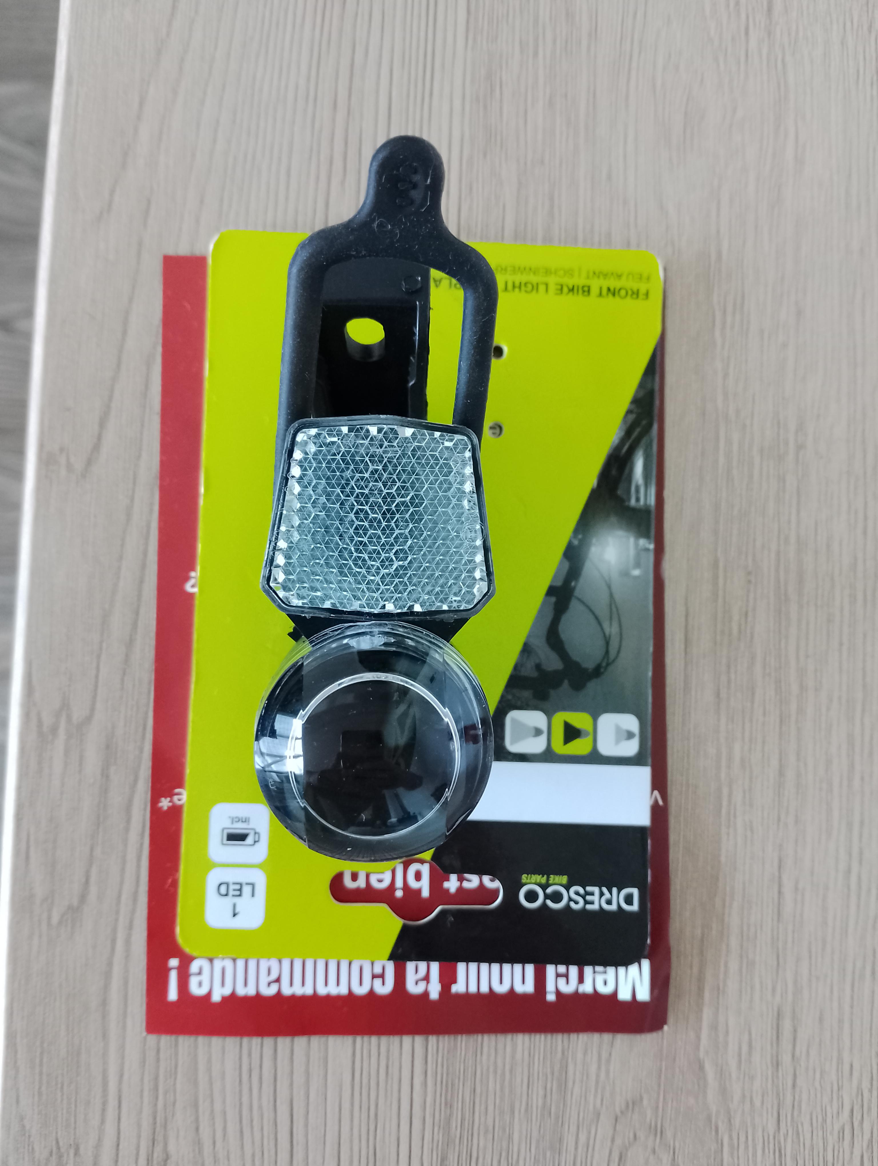Phare Dresco compact avec réflecteur blanc et 1 LED blanche brillante. Certifié CE. Avec bouton marche/arrêt. Fixation permanente sur la bague de couronne de la fourche avant ou sur le guidon grâce à l' attache en silicone. Fonctionne avec 2 piles CR 2032 fournies. Avec témoin de batterie.