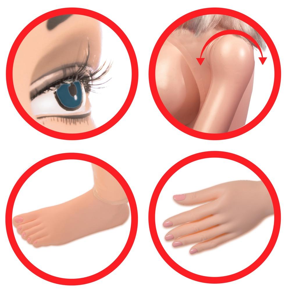 Cette poupée d'amour regarde le spectateur de manière sensuelle avec son séduisant visage en 3D et ses longs cheveux bruns. Les mains et les pieds sont également en forme et invitent à être caressés, tandis que les seins volumineux et joyeux aux mamelons fermes captivent. Les deux canaux de plaisance sont situés dans un masturbateur, qui est amovible et facilite le nettoyage. Elle est structurée à l'intérieur. Votre bouche est également prête pour des moments de poussée satisfaisants.