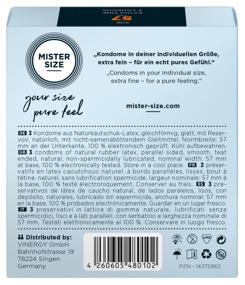 Préservatifs Mister Size transparents et extrêmement fins (57 mm) en latex de caoutchouc naturel.