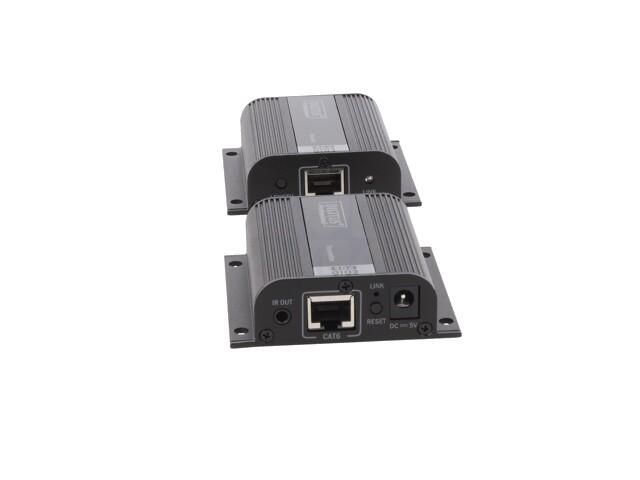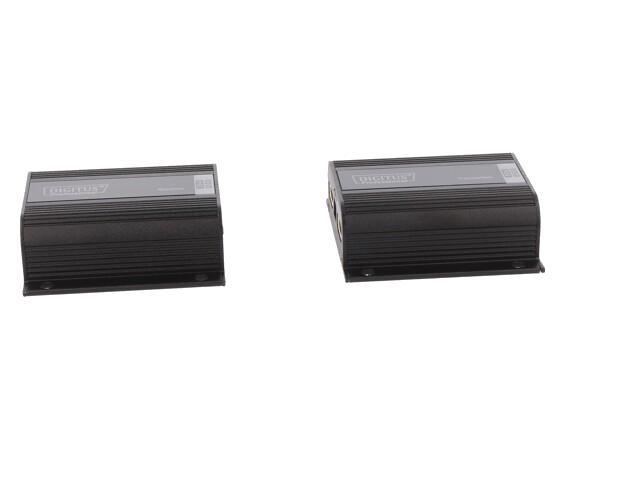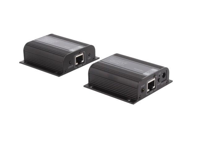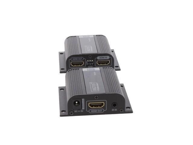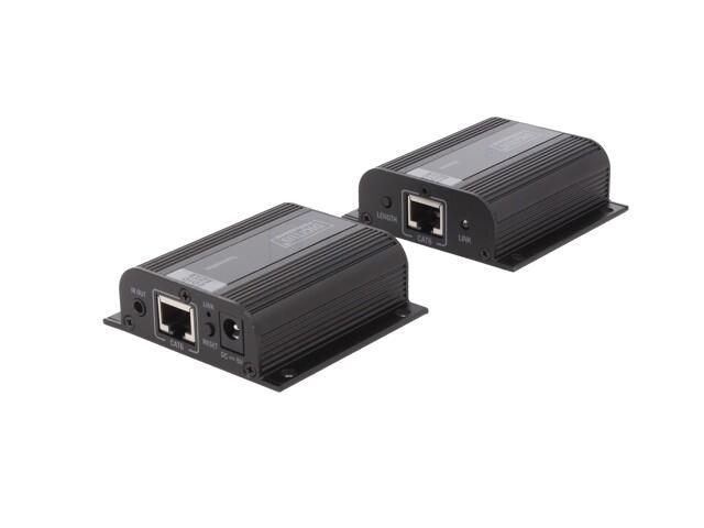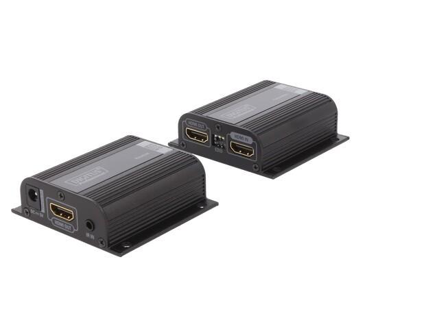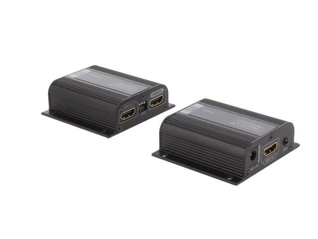 Kit d'extension HDMI, 50 m sur câble réseau (CAT 6/6a/7), EDID, 1x sortie boucle HDMI, FHD 1080p Le kit d'extension Digitus HDMI, Full HD offre une solution d'extension jusqu'à 50 m pour les exigences les plus élevées. Il est utilisé pour transmettre des signaux vidéo et audio numériques jusqu'à une longueur maximale de 50 m. La résolution vidéo la plus élevée prise en charge est 1080p / 60Hz. L'unité émettrice comporte un commutateur EDID, qui peut être utilisé pour réguler la résolution et le format audio du signal de sortie. L'émetteur dispose également d'un port HDMI Loop Out, qui vous permet de connecter un moniteur local. Grâce au support PoC (Power over Cable), c'est seulement l'émetteur qui doit être alimenté. Le forfait comprend deux unités infrarouges bidirectionnelles (émetteur, récepteur), qui peuvent être utilisées pour la télécommande de la source d'entrée connectée