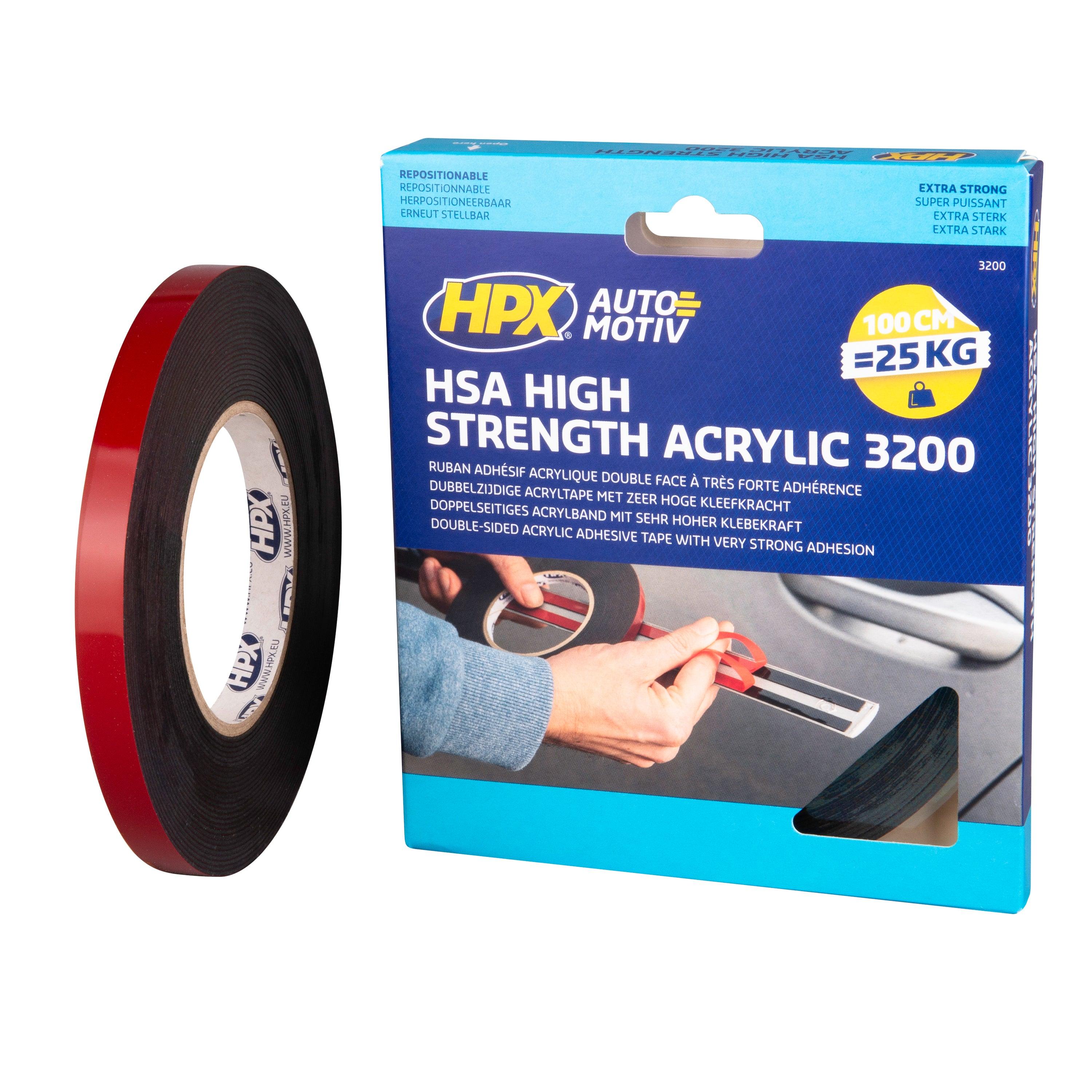 Le ruban adhésif double face HSA est une solution de fixation haute performance, idéale pour remplacer les vis, rivets, soudures et colles liquides. Grâce à sa forte adhérence, il permet une fixation fiable et durable des baguettes, moulures lourdes, emblèmes et pièces de renforcement sur une variété de surfaces. Caractéristiques et avantages : Adhésion ultra-forte : idéal pour les charges lourdes et surfaces complexes Multi-supports : excellente fixation sur métal, verre et plastiques Résistant aux solvants : ne se détériore pas sous l?effet des produits chimiques Repositionnable : permet un ajustement avant fixation définitive Remplace les fixations mécaniques : évite le perçage et facilite l?installation Utilisation en intérieur et extérieur : résistant aux conditions climatiques Spécifications techniques : Largeur : 12 mm Longueur : 10 m Épaisseur : 1,10 mm Support : mousse acrylique haute résistance Adhésif : acrylique ultra-performant Pouvoir adhésif : 53 N/25 mm Tenue en température : jusqu?à 93°C (temporairement jusqu?à 150°C)