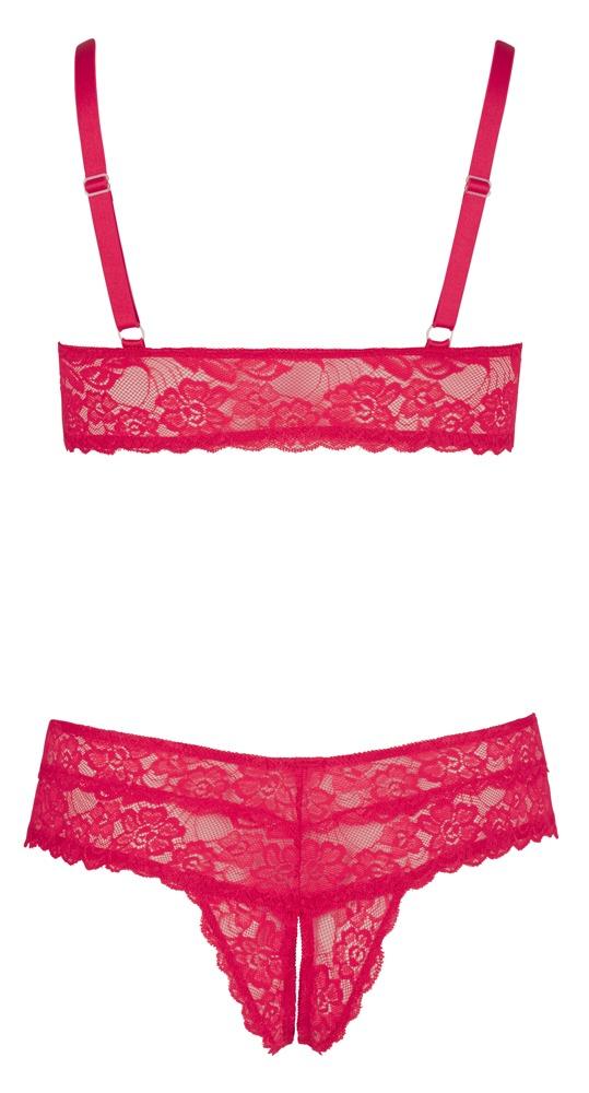 Delicate red lace: soft bra without fasteners and with adjustable straps. Additionally, a crotchless, artful string for passionate hours with your partner.
