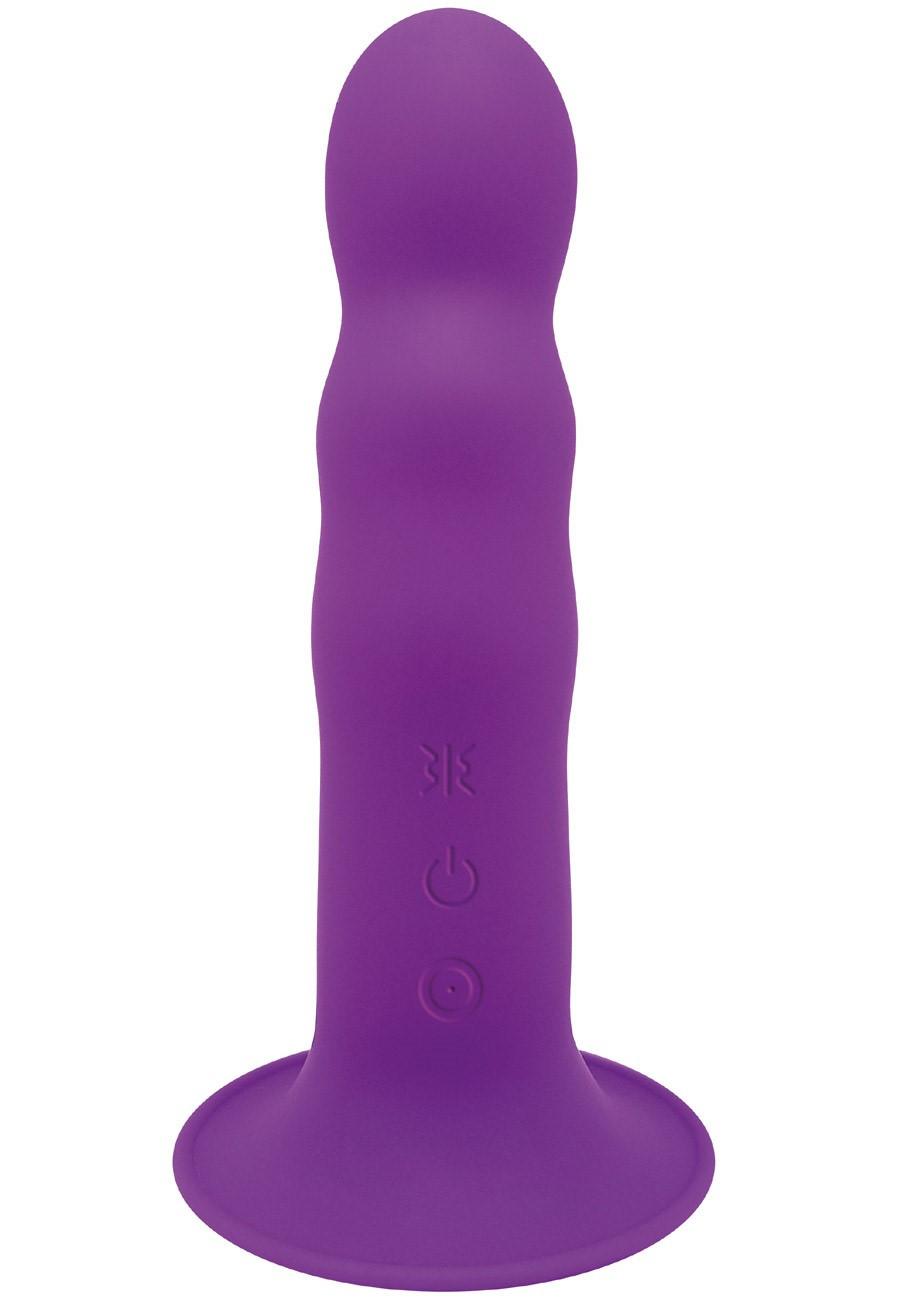 Vibromasseur violet avec ventouse et recouvert d'une peau douce en silicone.