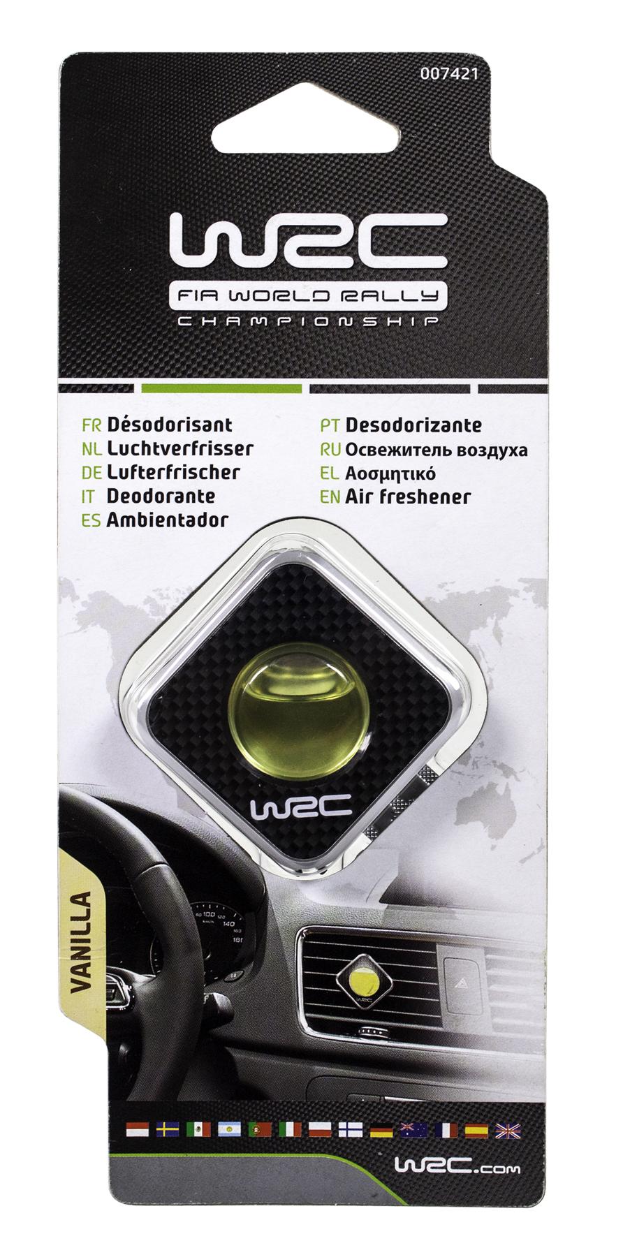 Désodorisant membrane pour Aérateur Senteur Vanille pour parfumer subtilement votre véhicule Ce désodorisant motif carbone et aux couleurs de WRC apportera également un style sport et chic à votre intérieur A fixer sur l'aérateur grâce à la pince au dos Parfum actif pendant une durée de 30jours Dimensions : 52x52x48mm
